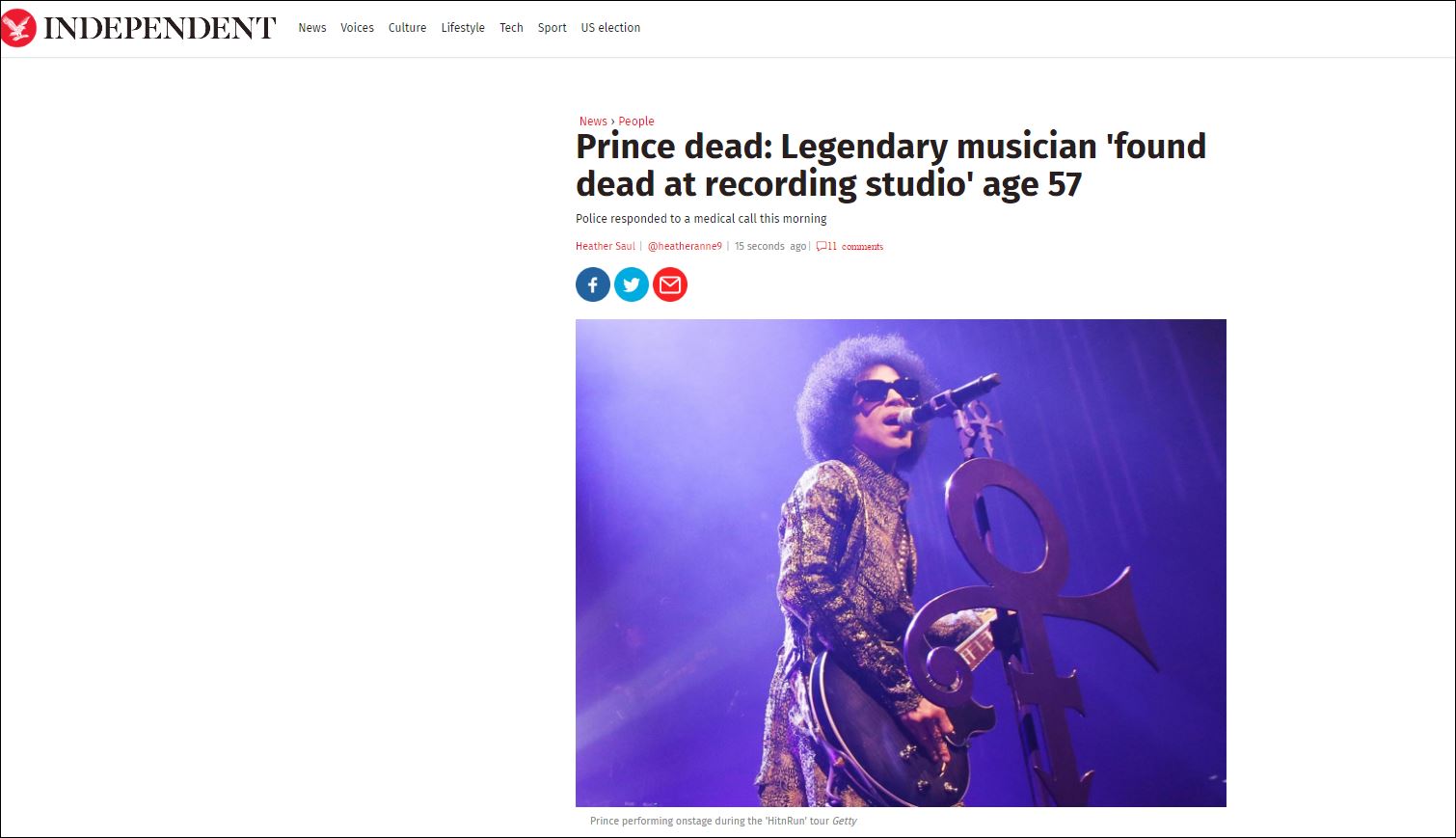 “O Prince νεκρός: O θρυλικός μουσικός βρέθηκε νεκρός στο στούντιο ηχογράφησης, σε ηλικία 57χρονών”, είναι ο τίτλος του Independent.