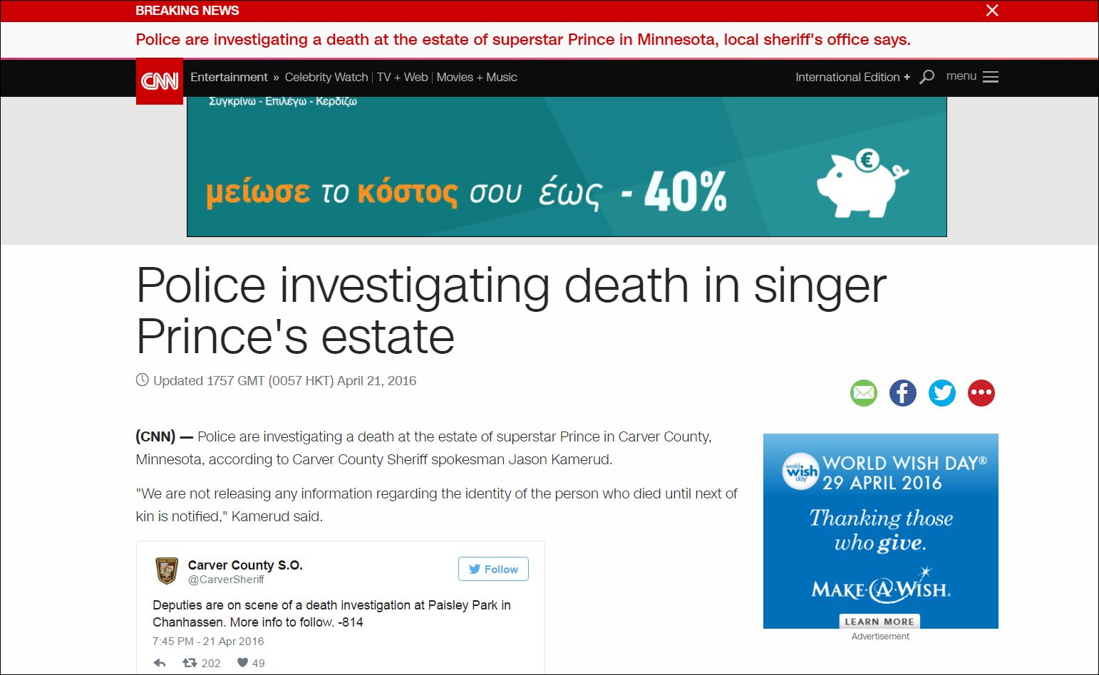 Το CNN γράφει: “Η αστυνομία διερευνά ένα θάνατο στην έπαυλη του Prince. Δεν έχει αναγνωριστεί το πτώμα, αναφέρει ο σερίφης, Τζέισον Καμερούντ.