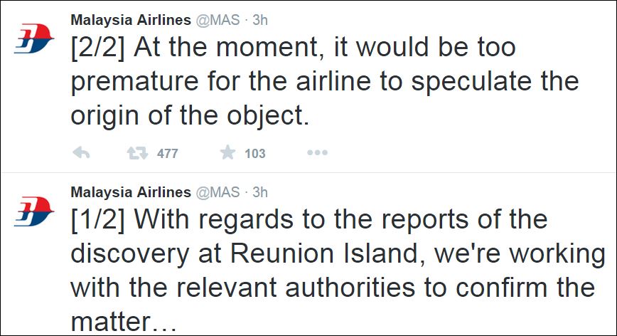 “Επί του παρόντος, θα ήταν πρόωρο για την αεροπορική εταιρία να προβεί σε εικασίες για την προέλευση του συγκεκριμένου κομματιού από συντρίμμια”, ανακοίνωσε η Malaysia Airlines προσθέτοντας ότι συνεργάζεται με τις “αρμόδιες αρχές για να εξακριβώσει” αν τα συντρίμμια αυτά προέρχονται ή όχι από το Boeing του στόλου της.