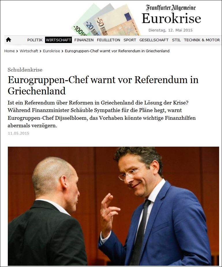 Η Frankfurter Allgemeine διερωτάται αν ένα δημοψήφισμα είναι η λύση για την κρίση στην Ελλάδα και προσθέτει ότι αν και ο Σόιμπλε συμφωνεί με το σχέδιο αυτό, ο Ντάισελμπλουμ εκτιμά ότι με αυτό τον τρόπο ενδέχεται να καθυστερήσει η καταβολή της βοήθειας προς την Αθήνα.