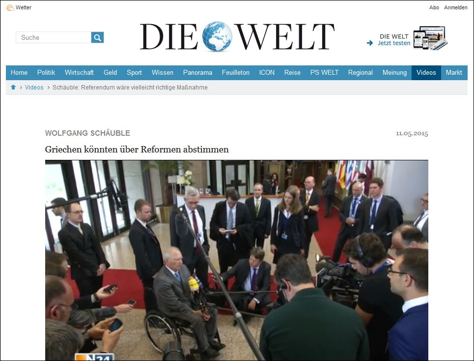 Η ίδια εφημερίδα σημειώνει ότι ο Γερμανός υπουργός Οικονομικών Βόλφγκανγκ Σόιμπλε επιθυμεί να αφήσει τους Έλληνες να προχωρήσουν σε δημοψήφισμα, μια ιδέα η οποία, σύμφωνα με τη Welt, βρίσκει ολοένα και περισσότερους υποστηρικτές στην Ευρωπαϊκή Ένωση.