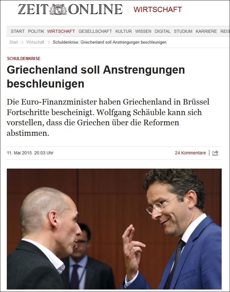 Το περιοδικό Der Spiegel επισημαίνει ότι σύντομα τα χρήματα της Ελλάδας θα τελειώσουν και όμως οι συζητήσεις μεταξύ του Eurogroup και της Αθήνας προχωρούν με πολύ αργούς ρυθμούς. Και προσθέτει: «ο Σόιμπλε έβαλε στο παιχνίδι ένα δημοψήφισμα, σαν να υπήρχε χρόνος για κάτι τέτοιο».