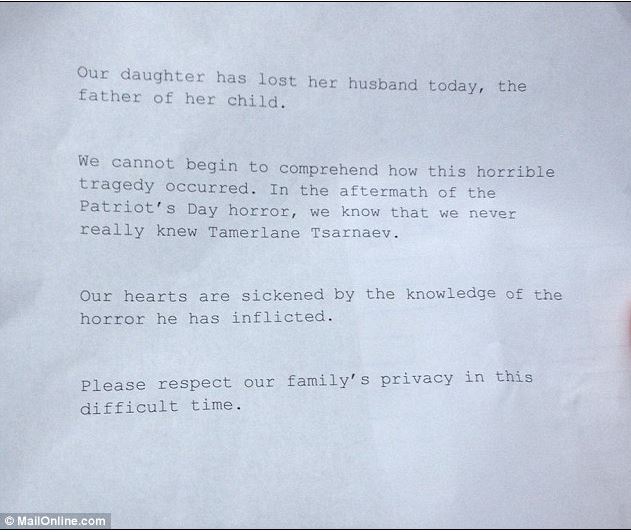 “Η κόρη μας έχασε το σύζυγό της σήμερα, τον πατέρα του παιδιού της. Δεν μπορούμε να κατανοήσουμε πόσο φρικτή τραγωδία είναι. Στο απόηχο του τρόμου της “Ημέρας του πατριώτη” , συνειδητοποιούμε ότι δεν γνωρίζαμε πραγματικά τον Tamerlane Tsarnaev.