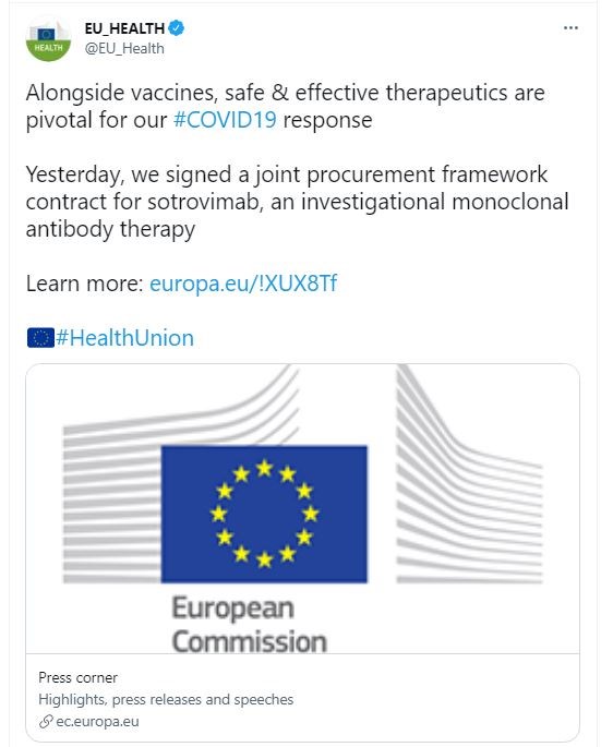 Η Ευρωπαϊκή Επιτροπή σύναψε περίπου 200 συμβάσεις, για διαφορετικά ιατρικά αντίμετρα, αξίας άνω των 12 δισεκατομμυρίων ευρώ. Σύμφωνα με την τρέχουσα σύμβαση-πλαίσιο με την GlaxoSmithKline, τα κράτη μέλη μπορούν να αγοράσουν το sotrovimab (VIR-7831), εάν και όταν χρειαστεί, αφού λάβει είτε άδεια έκτακτης ανάγκης στο οικείο κράτος μέλος είτε (υπό όρους) άδεια κυκλοφορίας σε επίπεδο ΕΕ από τον Ευρωπαϊκό Οργανισμό Φαρμάκων.