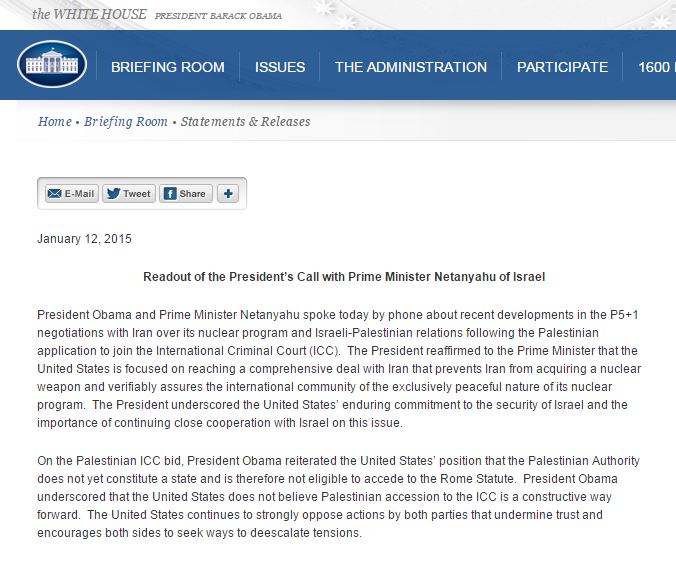 «Ο πρόεδρος Ομπάμα τόνισε ότι οι Ηνωμένες Πολιτείες δεν πιστεύουν ότι η ένταξη των Παλαιστινίων στο Διεθνές Ποινικό Δικαστήριο είναι ένας εποικοδομητικός τρόπος να προχωρήσουμε» ανακοίνωσε ο Λευκός Οίκος.