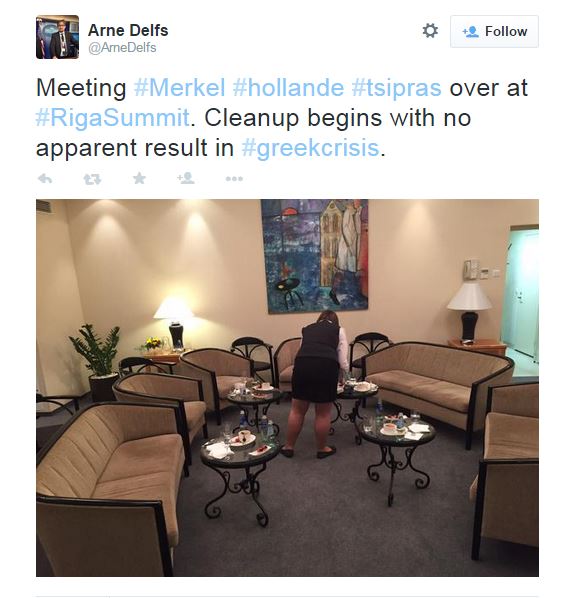 «Η συνάντηση Μέρκελ, Ολάντ, Τσίπρα στη Σύνοδο Κορυφής τελείωσε, αλλά κατά την καθαριότητα δεν βρέθηκαν εμφανή αποτελέσματα για την ελληνική οικονομική κρίση» έγραψε στο Twitter ο δημοσιογράφος του Bloomberg στο Βερολίνο, Arne Delfs.