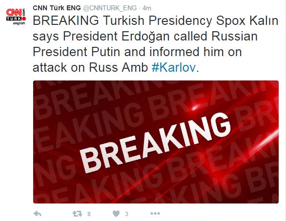 Ο Πρόεδρος της Τουρκίας Ταγίπ Ερντογάν, τηλεφώνησε στον Ρώσο Πρόεδρο Βλαντιμίρ Πούτιν, και τον ενημέρωσε σχετικά με την δολοφονική επίθεση εναντίον του Ρώσου Πρέσβη, Αντρέι Καρλόφ, σύμφωνα με το CNN Türk ENG.
