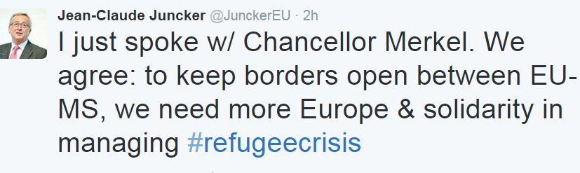“Μόλις μίλησα με την καγκελάριο Μέρκελ. Συμφωνούμε: για να κρατήσουμε ανοιχτά τα σύνορα μεταξύ των χωρών-μελών, χρειαζόμαστε περισσότερη Ευρώπη και περισσότερη αλληλεγγύη στη διαχείριση της προσφυγικής κρίσης” έγραψε στο Twitter ο Γιούνκερ, αναφερόμενος στις προσπάθειες που καταβάλει ο ίδιος, σε συνεργασία με το Βερολίνο, για να προωθήσει την εγκατάσταση των αιτούντων άσυλο σε όλες τις χώρες της ΕΕ.