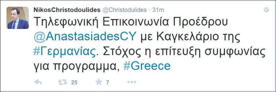 Σημειώνεται ότι ο Πρόεδρος Νίκος Αναστασιάδης είχε αργά χθες βράδυ τηλεφωνική επικοινωνία με τον πρωθυπουργό της Ελλάδας Αλέξη Τσίπρα, με τον οποίο αντάλλαξε απόψεις για τις εξελίξεις σε ό,τι αφορά το ελληνικό ζήτημα.