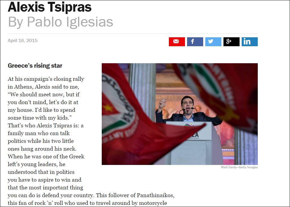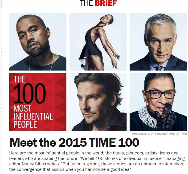 Στις 100 προσωπικότητες με την μεγαλύτερη επιρροή σε ολόκληρη τον κόσμο για το 2015 που επέλεξε το περιοδικό Time περιλαμβάνεται ο Έλληνας Πρωθυπουργός Αλέξης Τσίπρας.