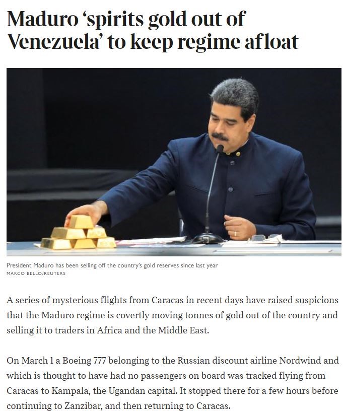 «Ο Μαδούρο βγάζει χρυσό από τη Βενεζουέλα για να κρατήσει το καθεστώς στη ζωή», αναφέρει δημοσίευμα των Times του Λονδίνου, όπου καταγράφονται αναλυτικά οι διαδρομές του κρατικού αεροσκάφους, γεμάτο με χρυσό, που έκανε στάση και στο «Ελευθέριος Βενιζέλος», στην Αθήνα, για 4 ώρες.