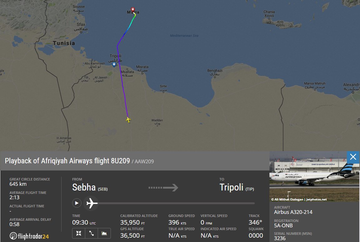 Το αεροπλάνο είχε απογειωθεί από την Σέμπχα της νοτιοδυτικής Λιβύης και κατευθυνόταν προς το αεροδρόμιο Μιτίγκα της Τρίπολης, μία διαδρομή που διαρκεί λίγο περισσότερο από δύο ώρες. Η αεροπορική εταιρεία Afriqiyah Airways είναι κρατική.