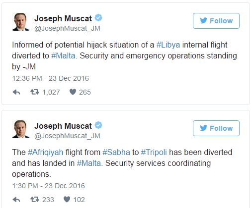 Ο Πρωθυπουργός της Μάλτας Τζόζεφ Μουσκάτ έγραψε στον λογαριασμό του στο Twitter: «Ενημερώθηκα για μία κατάσταση πιθανής αεροπειρατείας μίας εσωτερικής πτήσης της Λιβύης που κατευθύνεται στη Μάλτα. Είναι έτοιμες επιχειρήσεις ασφαλείας και αντιμετώπισης εκτάκτων καταστάσεων-ΤΜ».