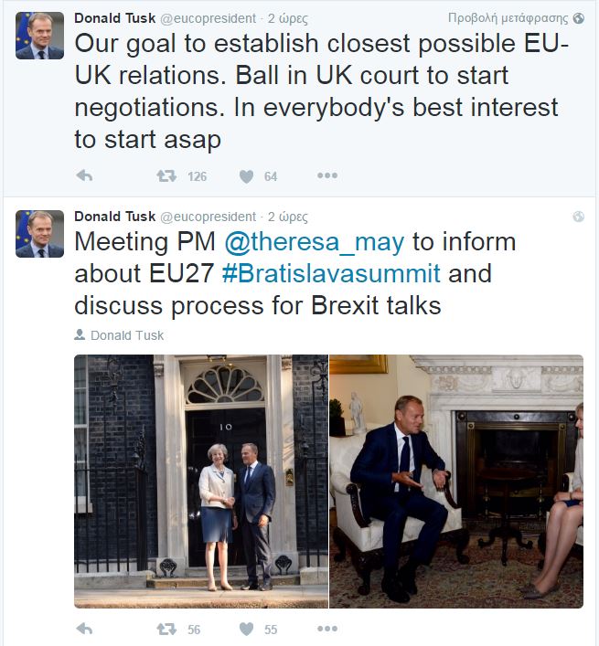 Ο “στόχος μας είναι να εγκαθιδρύσουμε τις πιο στενές δυνατές σχέσεις ΕΕ-Βρετανίας. Το μπαλάκι βρίσκεται στο γήπεδο της Βρετανίας για την έναρξη των διαπραγματεύσεων. Προς το συμφέρον όλων είναι να αρχίσουν το ταχύτερο δυνατό”, έγραψε ο Τουσκ στο Twitter.