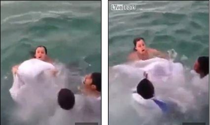 It took six people to pull the wedding dress out of the way and bring the bride to the surface of the water