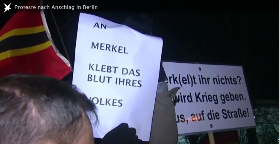 Οι υποστηρικτές του AfD φώναζαν συνθήματα εναντίον της Καγκελαρίου, ενώ σήκωσαν πλακάτ με μηνύματα όπως «να φύγει η Μέρκελ» και «έχεις αίμα στα χέρια σου».