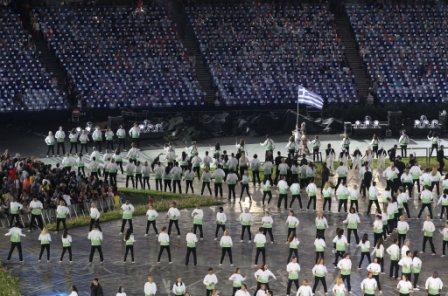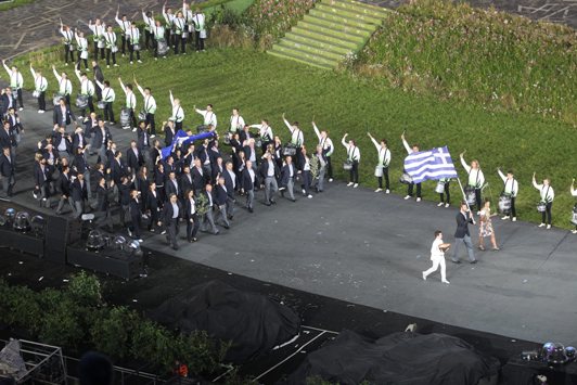 Στη συνέχεια, η σκυτάλη δόθηκε στους πραγματικούς πρωταγωνιστές των Ολυμπιακών Αγώνων, τους αθλητές. Πρώτη και υπερήφανη μπήκε στο Στάδιο η Ελληνική Ολυμπιακή Ομάδα δίνοντας το έναυσμα για την παρέλαση των 204 αποστολών που μετέχουν στους Ολυμπιακούς του Λονδίνου. Σημαιοφόρος μας, ο δύο φορές ασημένιος Ολυμπιονίκης στα 80 κιλά του τάε κβον ντο, Αλέξανδρος Νικολαΐδης, που στους Αγώνες του 2008 ήταν πρώτος λαμπαδηδρόμος στην τελετή αφής.