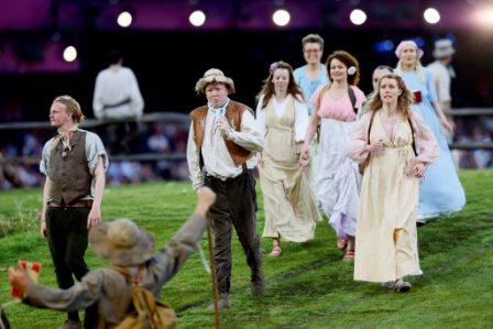 Οι βουκολικές σκηνές από την αγγλική εξοχή του 18ου αιώνα, οι καμινάδες εργοστασίων και η βιομηχανική επανάσταση, η αγγλική λογοτεχνία, πολλή μουσική για κάθε γούστο, αλλά και μπόλικες δόσεις βρετανικού φλεγματικού χιούμορ ενορχηστρωμένες από τον βραβευμένο με Όσκαρ σκηνοθέτη Ντάνι Μπόιλ και την παρουσία του κινηματογραφικού James Bond – κατά κόσμον Ντάνιελ Κρεγκ – επιβεβαίωσαν τον χολιγουντιανό χαρακτήρα της φαντασμαγορικής τελετής έναρξης των Ολυμπιακών Αγώνων του Λονδίνου.