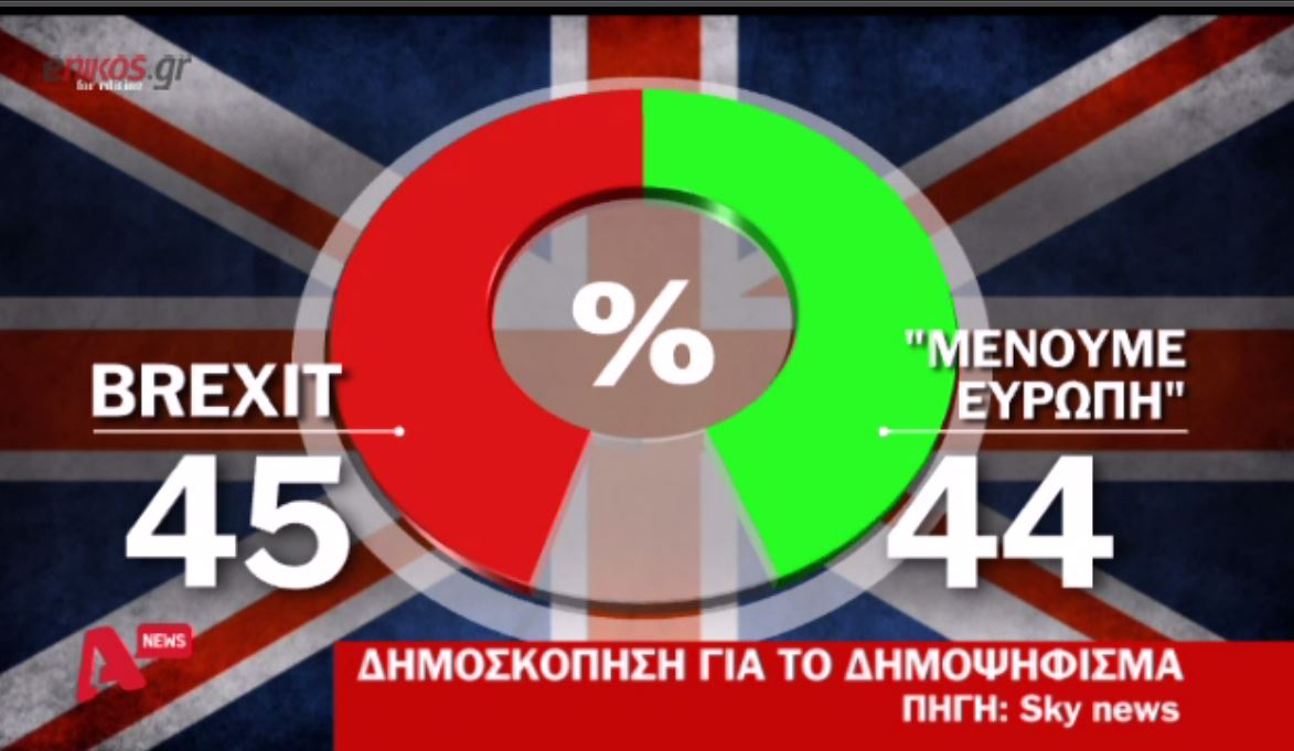 Σύμφωνα με τη δημοσκόπηση αυτή το Brexit συγκεντρώνει ποσοστό 45% ενώ η “Παραμονή” στην ΕΕ ποσοστό 44%.