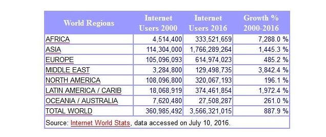 Εντυπωσιακό είναι το γεγονός ότι ραγδαία έχουν αυξηθεί οι χρήστες του παγκόσμιου Ιστού από το 2000, ακόμα και σε αναπτυσσόμενες περιοχές του κόσμου. Στην Αφρική για παράδειγμα, οι χρήστες του Διαδικτύου αυξήθηκαν κατά 7.288% σε σχέση με τις αρχές της χιλιετίας, ενώ σημαντική αύξηση σημειώθηκε και στη Λατινική Αμερική (1.972,4%), αλλά και την Μέση Ανατολή (3.842,4%).