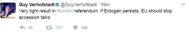 Ο πρόεδρος της ομάδας των Φιλελευθέρων στο Ευρωπαϊκό Κοινοβούλιο, Γκι Φερχόφστατ, μέσω του προσωπικού του λογαριασμού στο twitter, σχολίασε το οριακό αποτέλεσμα στο τουρκικό δημοψήφισμα και επανέφερε το ενταξιακό θέμα της Τουρκίας στην Ευρώπη.«Οριακό αποτέλεσμα στο τουρκικό δημοψήφισμα. Αν ο Ερντογάν επιμείνει η Ε.Ε. πρέπει να σταματήσει τις ενταξιακές συνομιλίες», έγραψε χαρακτηριστικά.