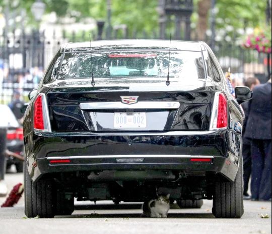 Ο Λάρι αποφάσισε να ξαπλώσει κάτω από την θωρακισμένη Cadillac του Τραμπ, αξίας 1,2 εκατομμυρίων λιρών, που σημαίνει ότι ο πρώην πρόεδρος των ΗΠΑ δεν μπορούσε να φύγει έπειτα από μια συνάντηση με την Τερέζα Μέι.