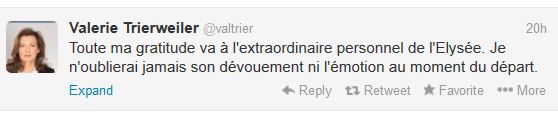Αποφάσισε να μην συνυπογράψει κοινή δήλωση με τον Φρανσουά Ολάντ προκειμένου να ανακοινώσουν το χωρισμό τους. Η Βαλερί Τριερβελέρ μίλησε μέσω “twitter”, αποχαιρετώντας το προσωπικό του Μεγάρου των Ηλυσίων.