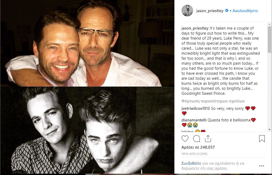 Το δικό του αντίο στον φίλο του Λουκ Πέρι έδωσε ο Μπράντον της σειράς Beverly Hills. O Jason Priestley, ήταν μάλλον ο μόνος από τους συμπρωταγωνιστές του Λουκ Πέρι, που δεν τον είχε αποχαιρετήσει με δημόσια δήλωση ή ανάρτηση. Ο λόγος; Τον εξηγεί ο ίδιος με μία συγκινητική ανάρτηση στο Instagram με δύο φωτογραφίες από το τότε και το σήμερα με τον ίδιο και τον Πέρι.