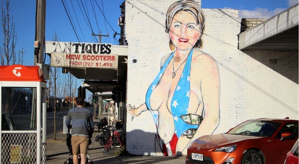 Ένα γκράφιτι που απεικονίζει τη Χίλαρι Κλίντον με αποκαλυπτικό μαγιό δημιούργησε σε έναν τοίχο σε προάστιο της Μελβούρνης, ένας καλλιτέχνης.Το τοπικό δημοτικό συμβούλιο ωστόσο ανέφερε ότι διατυπώθηκαν παράπονα από κατοίκους της περιοχής για το γεγονός ότι απεικονιζόταν μια τεράστια, ημίγυμνη γυναίκα δίπλα σε ένα κατάστημα με μοτοποδήλατα. Στο έργο, η υποψήφια του Δημοκρατικού Κόμματος για τις προεδρικές εκλογές των ΗΠΑ εικονιζόταν να φοράει ένα αποκαλυπτικό μαγιό στα χρώματα της αμερικανικής σημαίας, από το οποίο προεξείχαν δεσμίδες με χαρτονομίσματα των 100 δολαρίων.