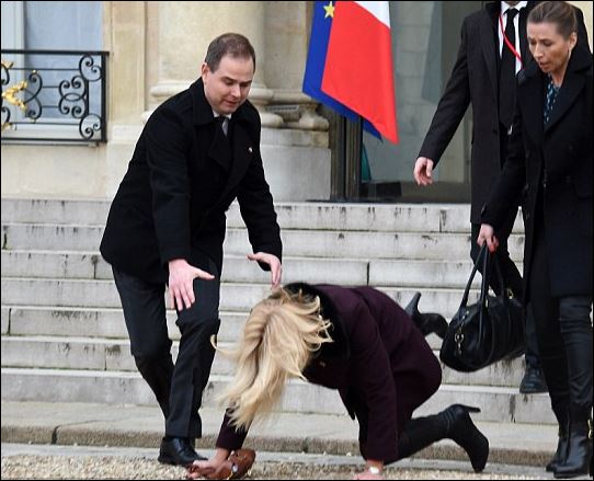 Τα φωτογραφικά φλας τράβηξε η εντυπωσιακή Πρωθυπουργός της Δανίας Χέλε Θόρνινγκ Σμιτ, η οποία, αποχωρώντας από τα Ηλύσια Πεδία, μετά τη διαδήλωση για το Charlie Hebdo, γλίστρησε στα σκαλιά.