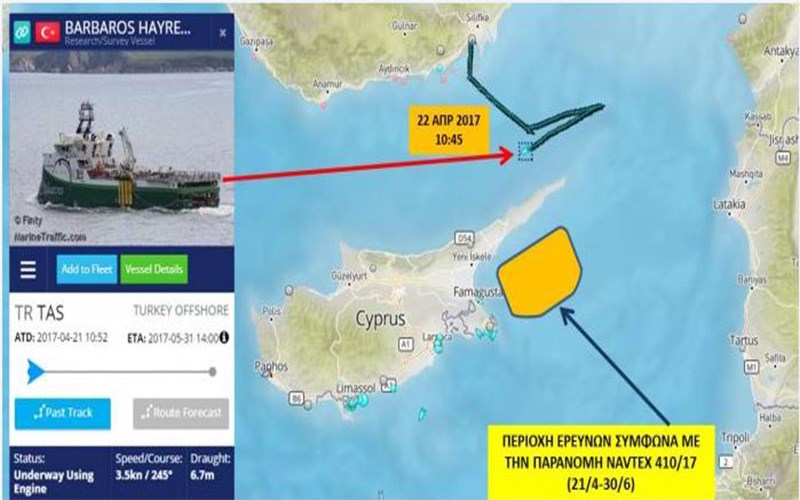 Το ερευνητικό πλοίο BARBAROS HAYREDDIN PASA της τουρκικής κρατικής εταιρείας πετρελαίου (TPAO), για το οποίο οι τουρκικές αρχές εξέδωσαν την παράνομη NAVTEX 410/17 προσπαθώντας να δεσμεύσουν περιοχή ανοικτά της Αμμοχώστου, εντός των χωρικών υδάτων της Κυπριακής Δημοκρατίας και εντός της κυπριακής ΑΟΖ, αφού αναχώρησε χθες, Παρασκευή, λίγο πριν τις 11 το πρωί από τον λιμένα TASUCU (βόρεια της Κύπρου) και έφτασε κοντά στην Κύπρο, άρχισε τις περιπλανήσεις εκτός της περιοχής ερευνών πλέοντας με πολύ μικρή ταχύτητα (2-4 κόμβοι).Σύμφωνα με το militaire.gr, το Barbaros δρα περισσότερο ως βραχίονας πίεσης προς την Κυπριακή Δημοκρατία στις συνομιλίες για το Κυπριακό. Σημειωτέον ότι η παράνομη δέσμευση της περιοχής αφορά το χρονικό διάστημα 21/4-30/6.