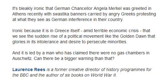 Ο Rees αναφέρεται στην υποδοχή της Άγκελας Μέρκελ στην Αθήνα, “στην καρδιά της οικονομικής κρίσης με ορισμένους Έλληνες διαδηλωτές να φορούν σβάστικες, για να καταγγείλουν την γερμανική ανάμειξη στα εσωτερικά της χώρας “.