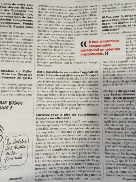 Το να λες σήμερα ότι οι Έλληνες πρέπει να πληρώσουν – κάτι που φαίνεται λογικό- είναι σαν λες ότι τα συνήθη θύματα πρέπει να υποφέρουν πάντα περισσότερο. Αυτό είναι μια αντίληψη «οφθαλμόν αντί οφθαλμού και οδόντα αντί οδόντος», ένα είδος «βιβλικής» οικονομίας, που αφήνει όλο τον κόσμο στην Ευρώπη άναυδο” αναφέρει μεταξύ άλλων στη συνέντευξή του ο υπουργός Οικονομικών.