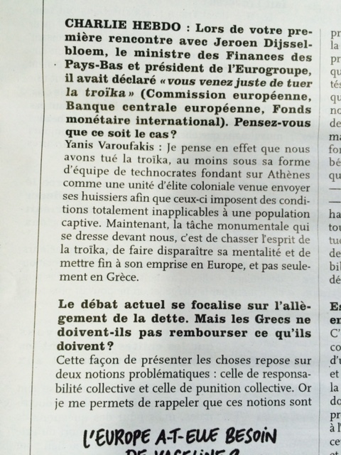 “Σκέφτομαι ότι πράγματι σκοτώσαμε την τρόικα, τουλάχιστον υπό τη μορφή που είχε, μιας ομάδας τεχνοκρατών που είχαν έδρα την Αθήνα σαν μια μονάδα αποικιακής ελίτ που έστειλε τους δικαστικούς επιμελητές της ώστε αυτοί να εφαρμόσουν όρους τελείως ανεφάρμοστους σε ένα αιχμάλωτο λαό.