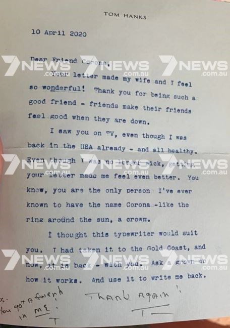 Ο Κορόνα Ντε Βρις, οκτώ ετών από το Γκολντ Κόουστ της Πολιτείας του Κουίνσλαντ, είχε γράψει στον Τομ Χανκς, ο οποίος μαζί με τη σύζυγό του Ρίτα Ουίλσον είχαν περάσει περισσότερες από δύο εβδομάδες σε καραντίνα στο παραλιακό αυτό θέρετρο της Αυστραλίας, καθώς είχαν διαγνωσθεί θετικοί στον κορονοϊό .