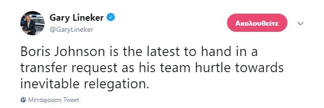 Ο παλαίμαχος Άγγλος διεθνής επιθετικός Γκάρι Λίνεκερ σχολίασε μέσω του λογαριασμού του στο Twitter την παραίτηση του Μπόρις Τζόνσον από τη θέση του υπουργού Εξωτερικών. Συγκεκριμένα ο Λίνεκερ παρομοιάζει τον Τζόνσον με τους ποδοσφαιριστές που ζητούν μεταγραφή λίγο πριν τον υποβιβασμό της ομάδας τους.