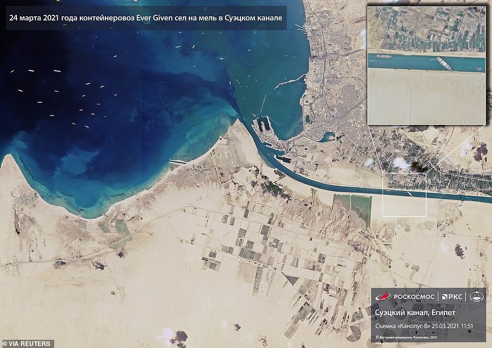 Δορυφορική εικόνα αποκαλύπτει το μέγεθος του “μποτιλιαρίσματος” που προκλήθηκε από την προσάραξη του τεράστιου πλοίου μεταφοράς εμπορευματοκιβωτίων “Ever Given” στη διώρυγα του Σουέζ. Περίπου 200 πλοία περιμένουν στη σειρά για να περάσουν από τη διώρυγα του Σουέζ, σύμφωνα με τη Daily Mail.