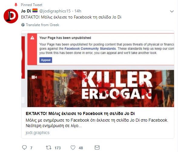 Λίγες ημέρες μετά την προειδοποίηση του Twitter να αποσύρει το γράφημα που είχε φτιάξει με τον Ερντογάν, το Facebook “κατέβασε” τη σελίδα του Έλληνα γραφίστα Jo Di.