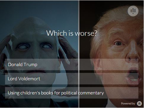 Όταν η συγγραφέας του Χάρι Πότερ κατάλαβε τι συμβαίνει ανέφερε ότι στην πραγματικότητα ο Τράμπ είναι χειρότερος από τον Βόλντερμοντ. Πολλοί συμφώνησαν με το σχόλιό της , ενώ άλλοι επισήμαναν ότι ο Τράμπ δεν έχει δολοφονήσει κανέναν. To μόνο σίγουρο πάντως, είναι ότι το σχόλιό της αποτέλεσε πηγή έμπνευσης για διάφορα κουίζ που κυκλοφορούν στο διαδίκτυο.