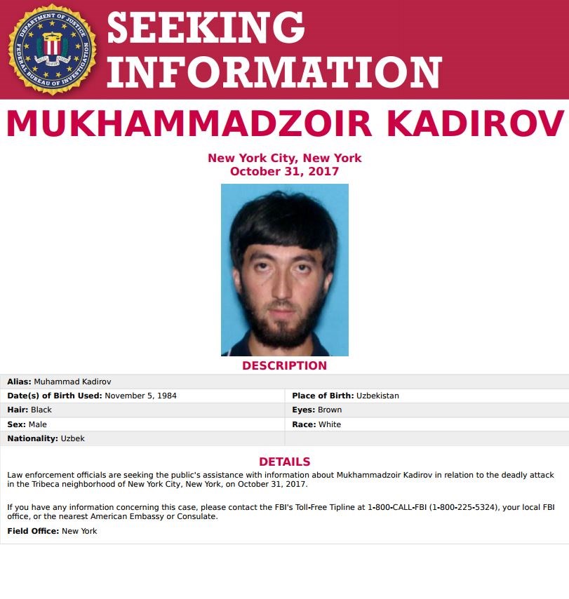 Tο FBI ανακοίνωσε ότι αναζητά πληροφορίες για έναν δεύτερο Ουζμπέκο που σχετίζεται με τη χθεσινή πολύνεκρη επίθεση στο Μανχάταν. Πρόκειται για τον 33χρονο Μουχάμαντ Καντίροφ, τη φωτογραφία του οποίου δημοσίευσε το FBI στην ιστοσελίδα του.