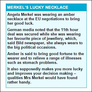 Το ίδιο κολιέ είχε επιλέξει η Γερμανίδα Καγκελάριος να φορέσει στη Σύνοδο Κορυφής τον Οκτώβριο του 2011, όταν είχε ληφθεί απόφαση για κούρεμα του ελληνικού χρέους κατά 50%.