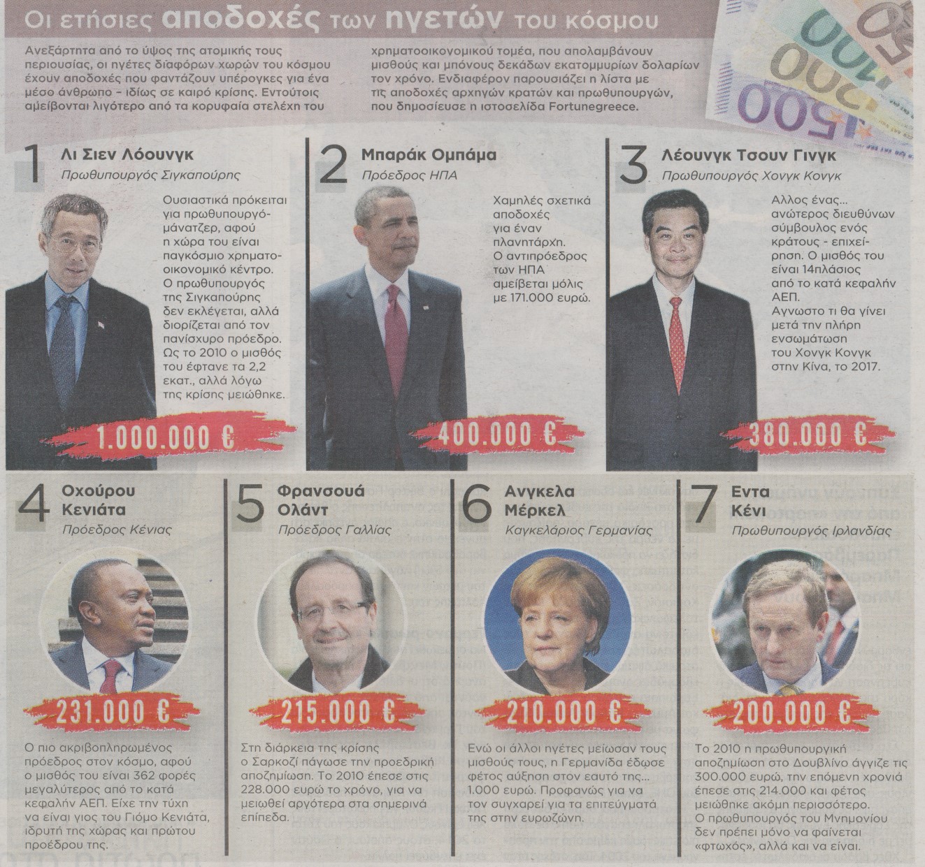 Ενδιαφέρον παρουσιάζει η λίστα με τις αποδοχές αρχηγών κρατών και Πρωθυπουργών, που δημοσίευσε η ιστοσελίδα Fortunegreece.