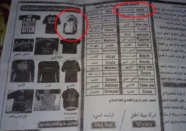 Ειδικά για τη δεύτερη, ο λόγος της απαγόρευσης είναι πως η λέξη Nike ακούγεται παρόμοια με μια αραβική λέξη αργκό για τη σεξουαλική πράξη, όπως αναφέρουν τα μέλη της οργάνωσης ακτιβιστών «Η Ράκα σφαγιάζεται Σιωπηλά» που φωτογράφισαν και διέδωσαν στο ίντερνετ το σχετικό φυλλάδιο των Τζιχαντιστών.