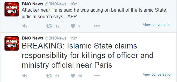 Όπως μεταδίδουν τα διεθνή ΜΜΕ, ο δράστης ενήργησε για λογαριασμό των τζιχαντιστών με την ιστοσελίδα, «Bno News» σε ρεπορτάζ της να αναφέρει πως «δικαστική πηγή στη Γαλλία επιβεβαιώνει πως ο δράστης σε περιοχή κοντά στο Παρίσι ενεργούσε για λογαριασμό του “Ισλαμικού Κράτους”».