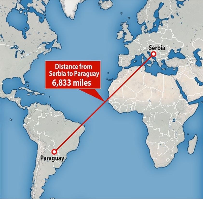 Το εμπορευματοκιβώτιο έφυγε από τη Σερβία στις 21 Ιουλίου και έφτασε νωρίτερα αυτήν την εβδομάδα μέσω Αργεντινής στο λιμάνι Βιλέτα, 30 χλμ νότια της πρωτεύουσας Ασουνσιόν, στον Ποταμό Παραγουάης, δήλωσε ο εισαγγελέας Μαρσέλο Σαλδιβάρ.