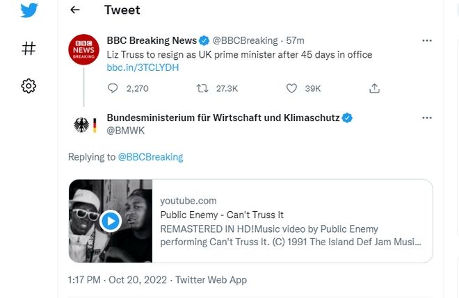 Η διεθνής διπλωματία, η βρετανική πολιτική και η αμερικανική ραπ μπορεί να είναι ένας κακός συνδυασμός. Αυτό έμαθε το υπουργείο Οικονομικών της Γερμανίας αφού ανήρτησε στο Twitter έναν σύνδεσμο με ένα βίντεο του μουσικού συγκροτήματος Public Enemy ως αντίδραση στην είδηση της παραίτησης της πρωθυπουργού της Βρετανίας Λιζ Τρας.