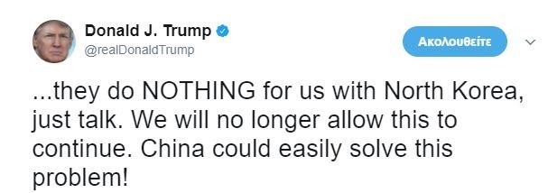 «…Δεν κάνουν ΤΙΠΟΤΑ για μας σε ό,τι αφορά την Βόρεια Κορέα, εκτός από το να μιλάνε. Δεν θα επιτρέψουμε πλέον αυτό να συνεχιστεί. Η Κίνα μπορεί εύκολα να λύσει αυτό το πρόβλημα!», τόνισε ο πρόεδρος των ΗΠΑ με την επακόλουθη ανάρτησή του.