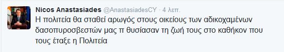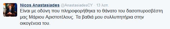 Ο κ. Αναστασιάδης έγραψε στο Twitter: «Είναι με οδύνη που πληροφορήθηκα το θάνατο του δασοπυροσβέστη μας Μάριου Αριστοτέλους. Τα βαθιά μου συλλυπητήρια στην οικογένεια του».