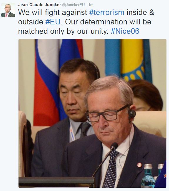 Ο πρόεδρος της Κομισιόν, Ζαν Κλοντ Γιούνκερ, σε μήνυμά του στον προσωπικό του λογαριασμό στο twitter για την επίθεση στη Νίκαια, κάνει λόγο για τρομοκρατία.