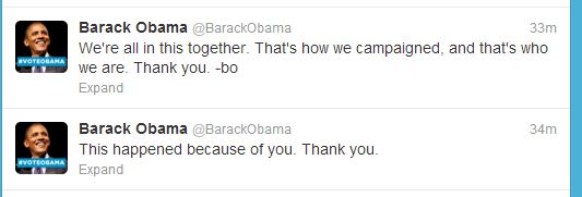 “Αυτό έγινε χάρη σε σας. Σας ευχαριστώ”, έγραψε ο πρόεδρος των Ηνωμένων Πολιτειών Μπαράκ Ομπάμα στον λογαριασμό του στο Twitter, αμέσως μετά την ανακοίνωση ότι σύμφωνα με τις εκτιμήσεις κερδίζει τις προεδρικές εκλογές.